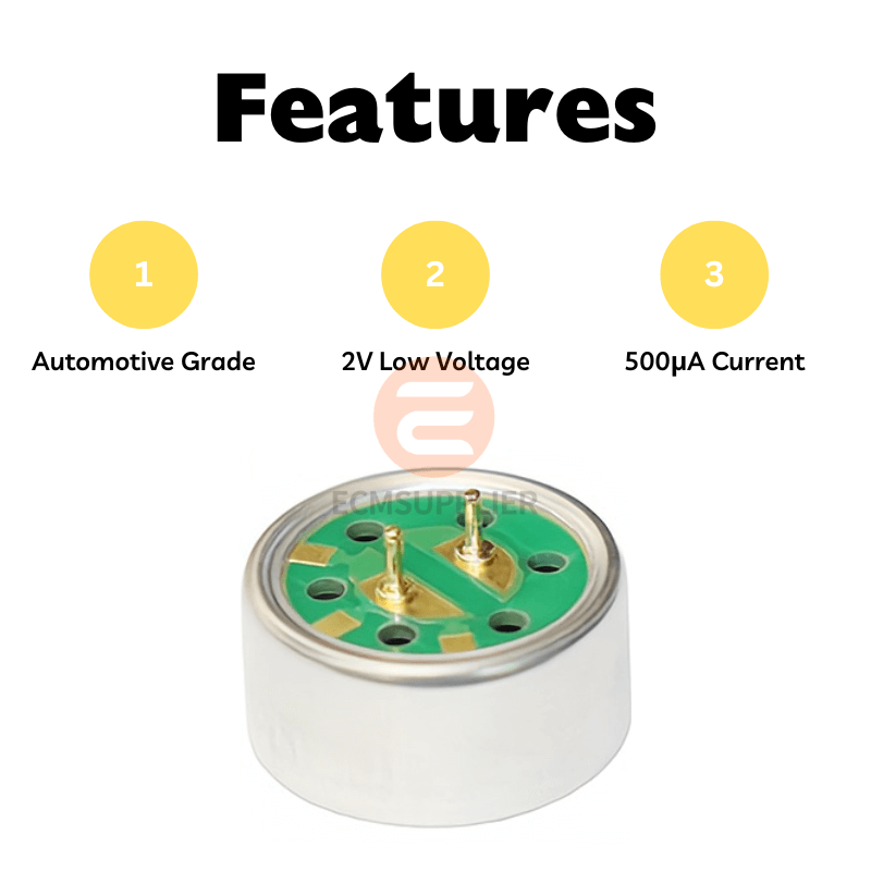 9.7mm automotive grade microphone for car cabin applications. Operates at 2V with low 500μA current consumption, meeting automotive requirements.